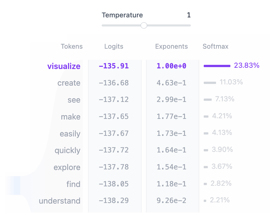 数学的に言えば、これは非常に単純な操作です。モデル出力のロジットを temperature で単純に割るだけです:
